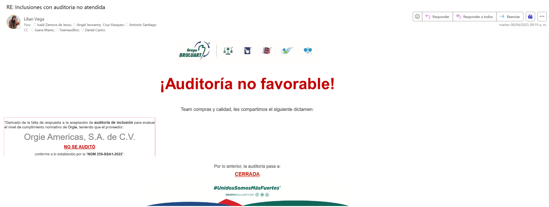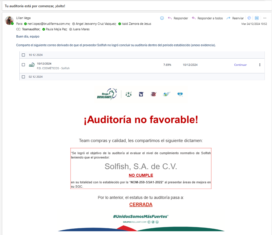 SOLFISH, S.A. DE C.V. | DISTRIBUIDOR | COSMETICOS | 05/02/2025 | No requiere | 06/12/2024 | 24/12/2024 | NO FAVORABLE - NO COMPLETO SU AUDITORIA | |